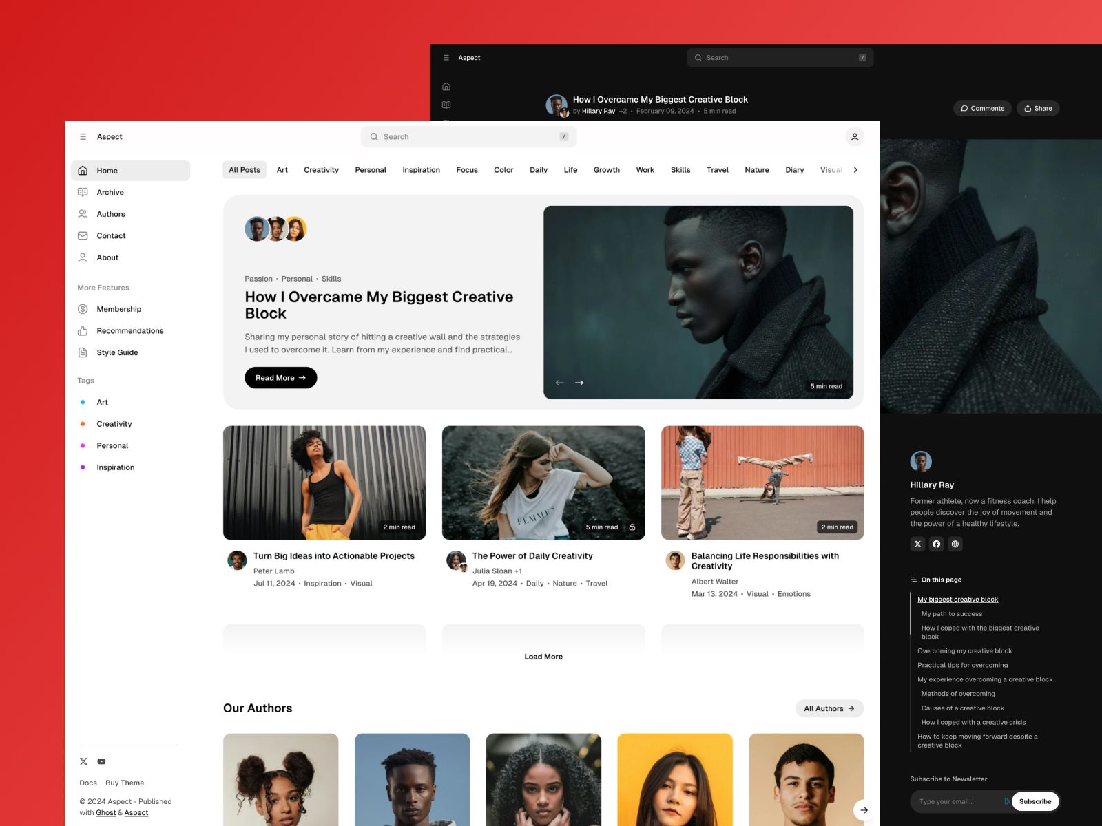 Aspect is a magazine and co-author blog Ghost theme with a grid layout and side navigation. Demo: https://aspect.priority.vision/Documentation: https://www.priority.vision/docs/aspect/Contact: https://www.priority.vision/contact/ → Included theme files→ Included lifetime updates→ Included one year of technical support