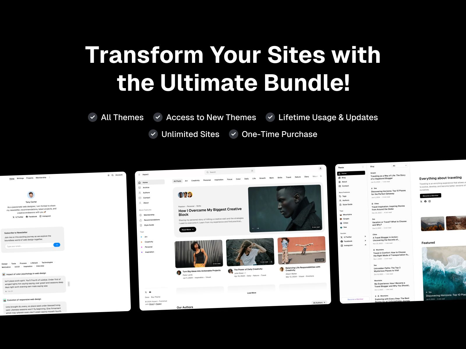 Enjoy lifetime updates and access to all current and future Ghost Premium Themes, ensuring your sites stays up-to-date with the latest designs and features.
