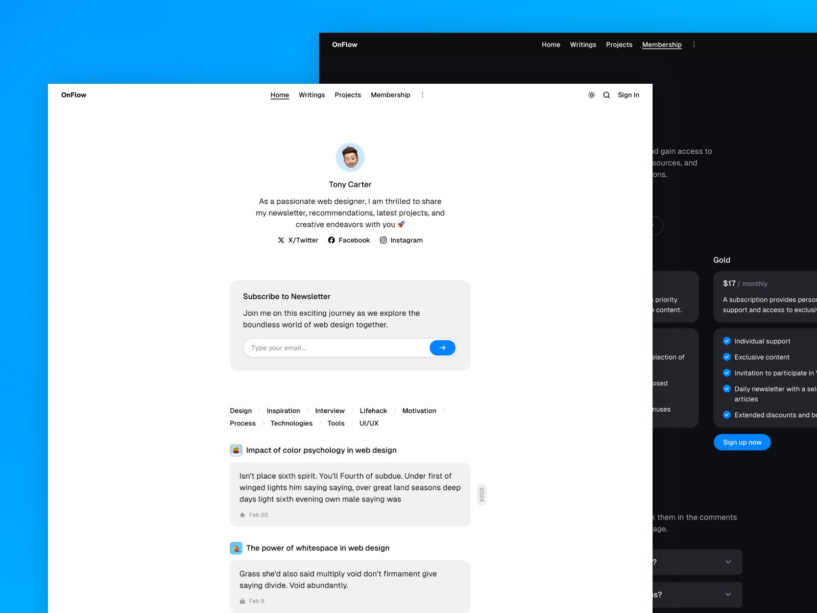 OnFlow is a Ghost theme that offers a minimal chat-like layout for personal blogs and portfolios. Demo: https://onflow.priority.vision/Documentation: https://www.priority.vision/docs/onflow/Contact: https://www.priority.vision/contact/ → Included theme files→ Included lifetime updates→ Included one year of technical support