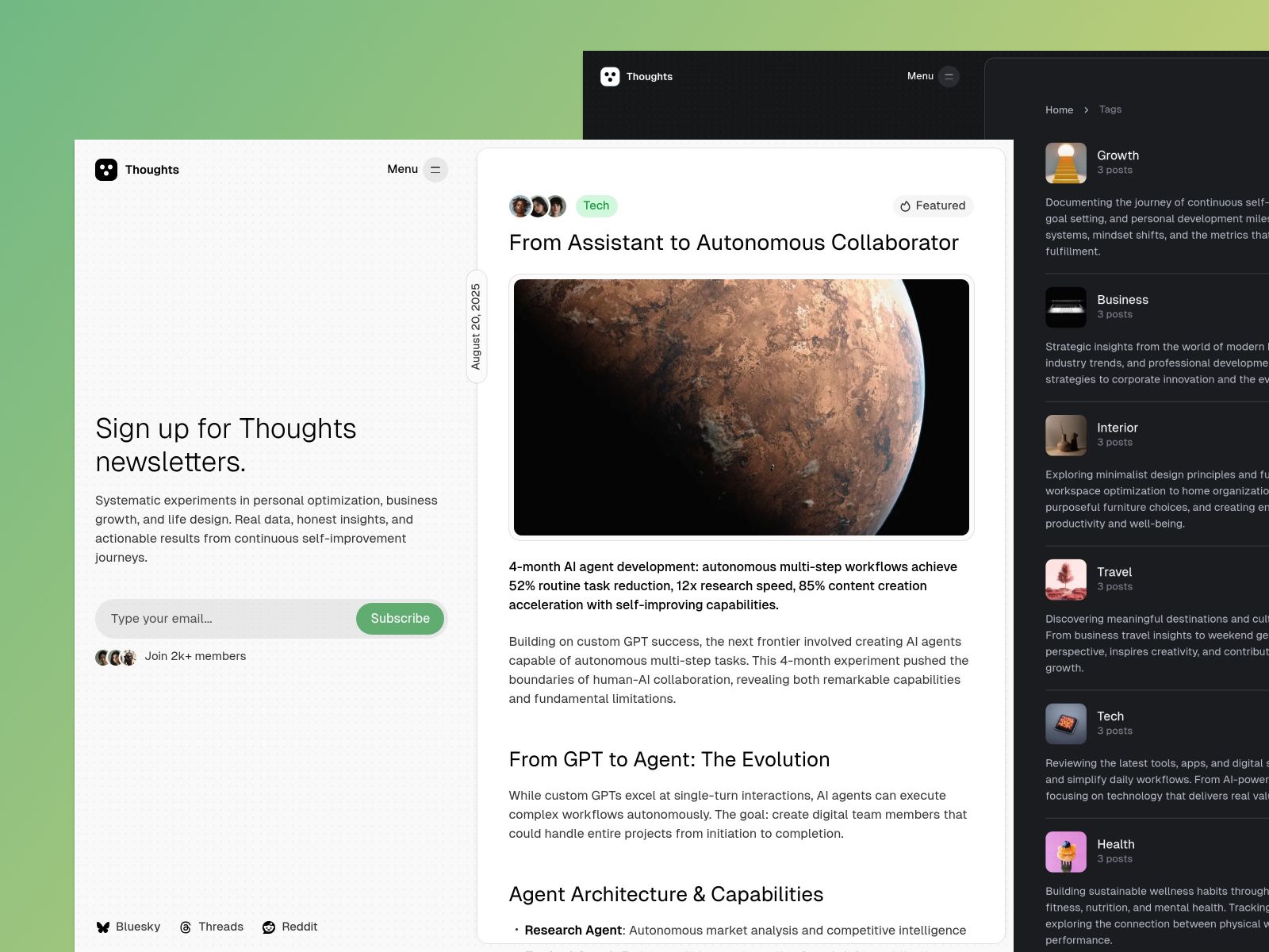 Thoughts is a distinctive split-screen theme for newsletters with collaborative writing support. Demo: https://thoughts.priority.vision/Documentation: https://www.priority.vision/docs/thoughts/Contact: https://www.priority.vision/contact/ → Included theme files→ Included lifetime updates→ Included one year of technical support